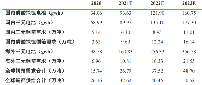 锂电铜箔轻薄化是未来的主流趋势。锂电铜箔越薄,对电池的能量密度提升作用越大。根据 GGII 数据,采用 6 微米极薄铜箔相较于 8 微米铜箔可将锂电池能量密度提升约 5%;随着未来国内新能源车、储能、消费等领域对超薄锂电铜箔的需求快速增加,预计 2020-2022 年国内 6 微米极薄锂电铜箔实际有效产能稳健增加。![]()