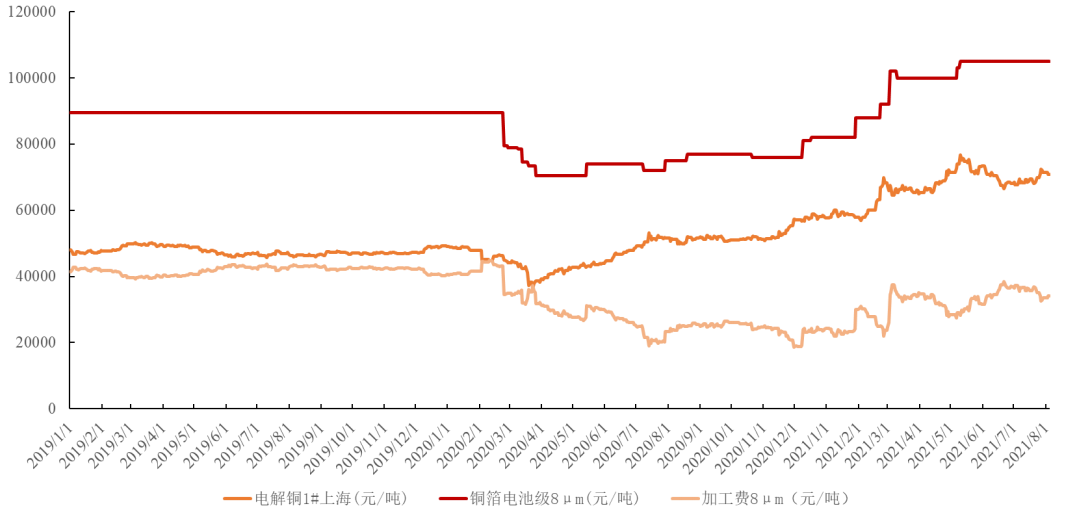 铜箔产品的定价主要采取成本加成的模式,国内以上海有色金属 1#铜为基准,海外以 LME 铜为基准,加上加工费构成铜箔价格。2020 年四季度以来在下游需求快速回暖的的带动下,供需关系改善显著,铜箔加工费环比开始回升。![]()