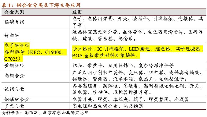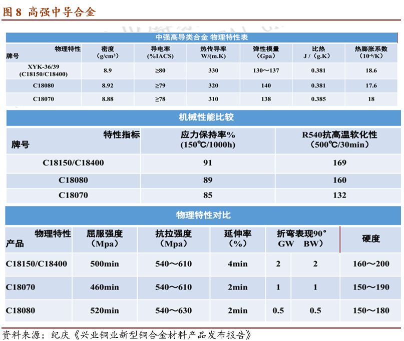 2.Cu-Ni-Si和Cu-Cr-Zr合金板带属于中高强度高导电率合金,国内博威合金已经可以批量化生产,兴业盛泰铜业可以批量化生产Cu-Ni-Si合金。铍铜(Cu-Be)国内仅有东方钽业可以生产,Cu-Ti国内公司还无法供应。尤其是Cu-Ni-Si合金由于优异的高温稳定性,在电子领域开始广泛应用。