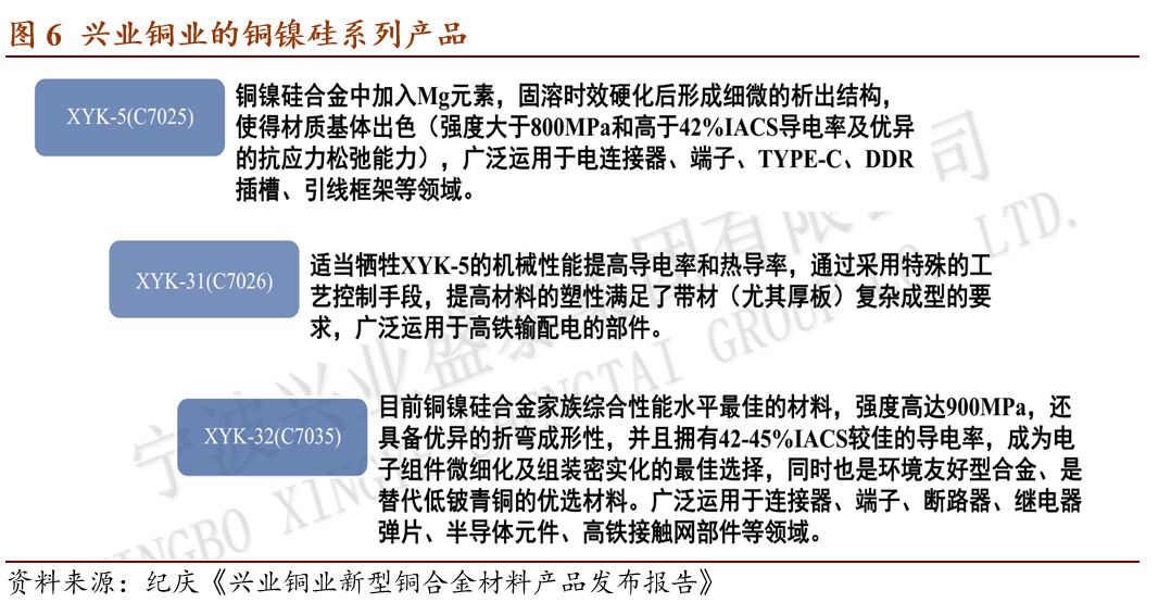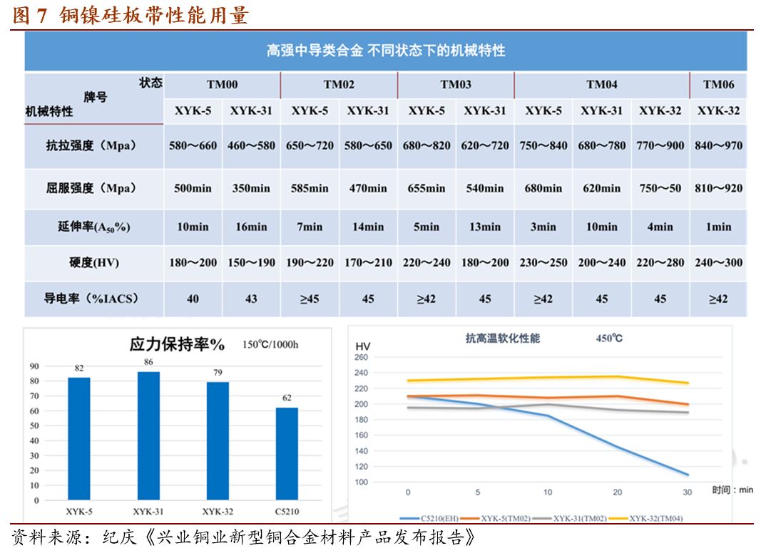 6.我国铜加工行业经历了三个阶段,目前进入了以C7025为代表的高性能材料阶段。以满足通讯、电子和汽车等行业的需求升级。兴业盛泰铜业开发了C7026和C7035铜镍硅材料。C7035性能优异,可部分替代低铍铜合金。