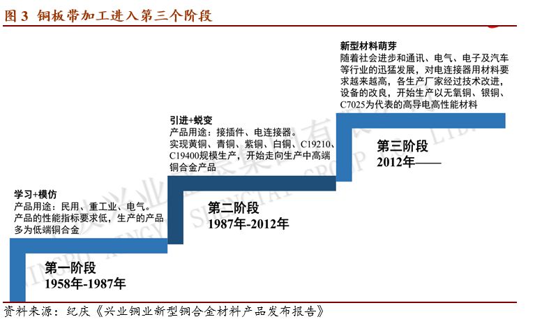 我国铜加工行业经历了三个阶段,目前进入了以 C7025 为代表的高性能材料阶段。以满 足通讯、电子和汽车等行业的需求升级