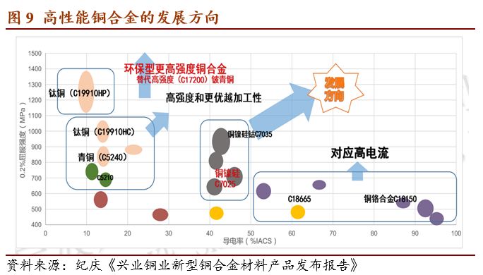 8.未来高性能铜合金的发展可能存在以下四个方向:(1)双70合金,抗拉强度700MPa、导电率70%IACS、厚度0.03-0.06mm;(2)环保型材料,抗拉强度>1000 MPa、屈服强度>950 MPa、导电率>45 %IACS;(3)复合类新型材料,利用各金属品种的特性及优势,实现综合性能的提升及成本的优化;(4)磁性导电材料,CFA铜铁合金产品、一般铁含量为15-50%。