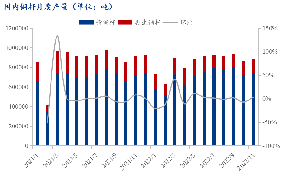 据调研57家样本企业,总计产能1374.5万吨,2022年11月全国精铜制杆产量为74.58万吨,环比增加3.03%,同比增加3.34%;2022年11月精铜制杆产能利用率为66.02%,环比上升9.02%,同比下滑2.83%。