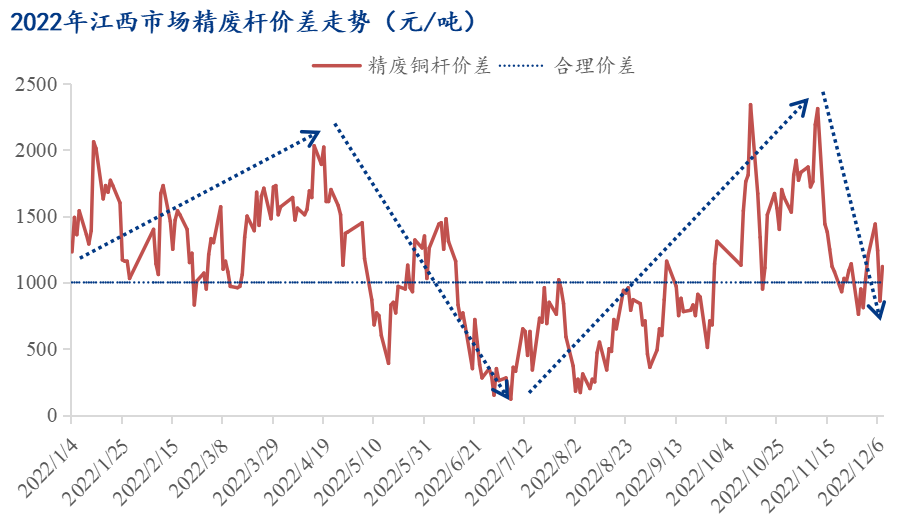 精废铜杆价差方面,月内市场精废铜杆价差环比回落表现明显,市场价差的收窄主要来源于再生铜杆现货价格坚挺,而低价精铜杆货源不断冲击市场所致。市场再生铜杆企业因原料到厂少且价格调价空间小,价格的相对坚挺一定程度拉低市场精废铜杆价差,从目前表现来看,近期精废杆价差围绕合理价差的水平上下波动,在再生铜原料、铜杆现货价格坚挺的阶段内,较难有很大幅度拉升。