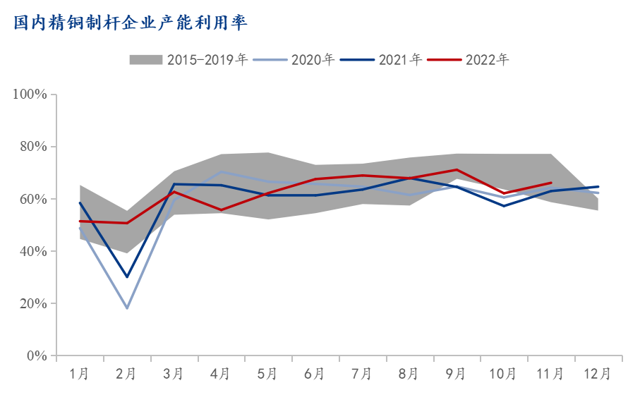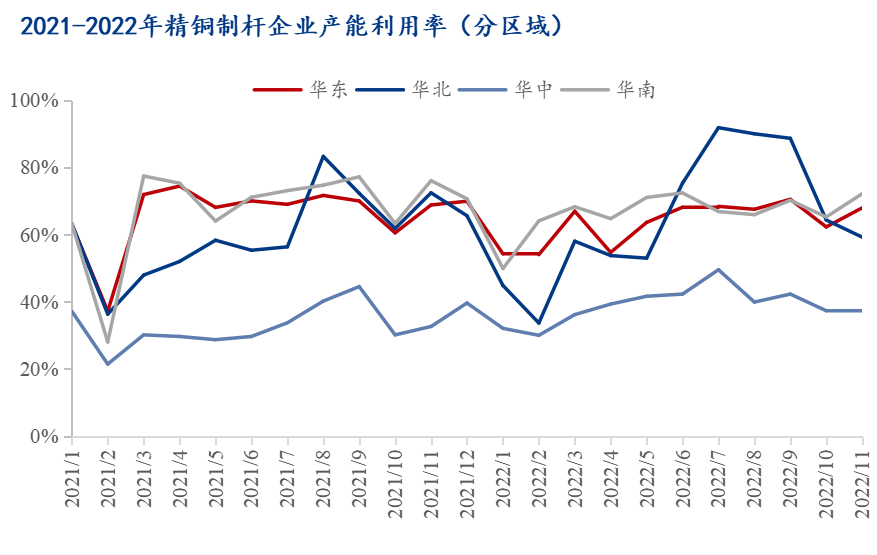 分区域来看,11月除华北市场外,华东、华中、华南整体产出皆有回升或者持平;华北市场产出表现区别于其他市场的主要原因在于区域受疫情影响较大,河北、天津一带11月疫情管控时间长且严格,再加上华北冬季致使终端表现下滑,从数据表现来看,华北市场11月产能利用率下滑5个百分点;华东、华南市场11月产出回升幅度分别为5.6%和6.9%,据厂家反馈,11月这两区域内铜杆企业疫情影响相对缓解,且因前期减停产企业11月开始正常生产交付订单,故产能利用率有大幅提振。