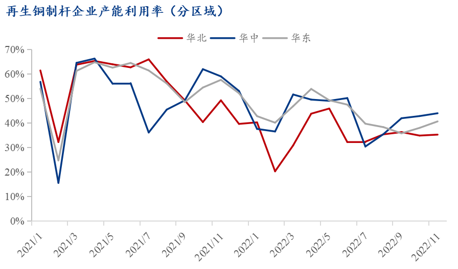 分区域看,11月各市场产能利用率表现基本一致,皆有不同程度提升;其中华东区域增产表现最为明显,主要也是由于前期疫情影响逐渐消散以及华北等市场需求转移至华东市场,一定程度带动区域市场铜杆消费,但再生铜杆整体消费依旧处于相对较低水平现状不变,故增幅也不大;华北、华中市场而言,11月区域内都受到突发疫情的干扰,好在持续时间相对较短且控制得当,区域内铜杆消费虽有减弱,但当地终端企业的消费需求开始集中,一定程度遏制了下滑趋势。