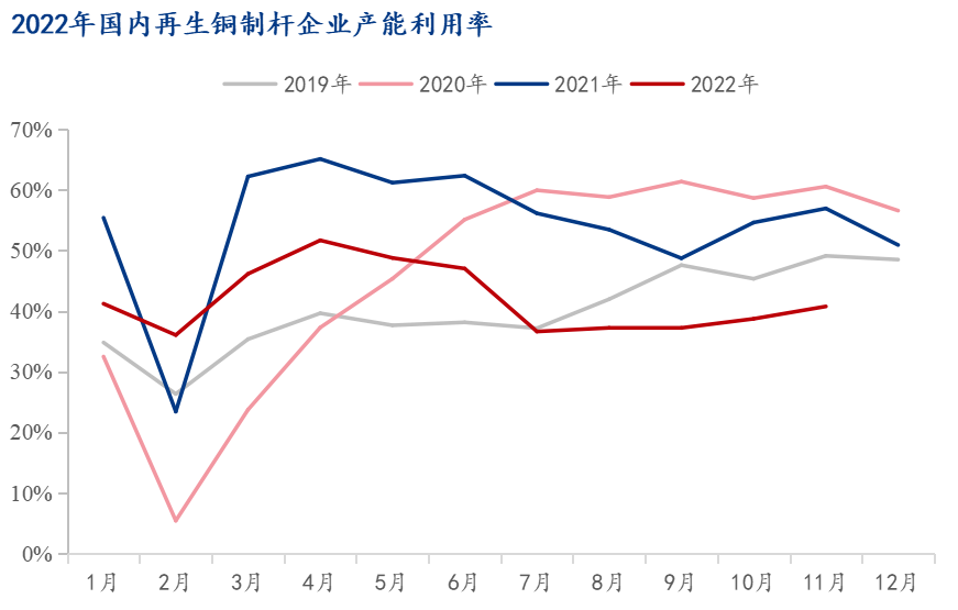 据调研37家样本企业统计,总计产能427万吨,2022年11月再生铜杆产量为14.32万吨,环比增长1.87%,同比下滑27.54%;11月再生铜杆企业产能利用率为40.79%,环比增长2.04%,同比下滑28.38%。