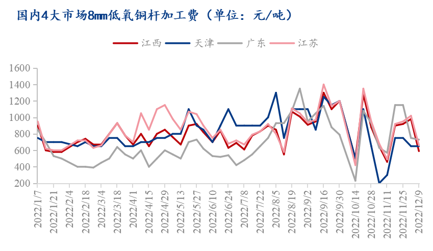 11月市场加工费整体呈现先抑后扬走势,交割前后依然存在明显价差,但较10月变化幅度有所收窄。月内广东市场价格基本占领高位,其实际成交表现却并无大幅增长,虽月内产出明显回升,但也是对比10月低水平产出而言。从各市场来看,华东市场加工费自高位回落,市场整体交投表现不佳,尤其是在铜价连续走高之后,部分厂商迫于成品压力开始低价报盘清理厂内库存;华北市场加工费月内处于国内市场低位,当地疫情以及北方雪季来临导致需求持续下滑,厂家开始下调产能以及加工费适应市场变化;华南市场受疫情影响,当地原料供应出现阶段性短缺,导致当地部分厂家月内开工不足,且迫于高升水压力加工费持续处于高位。