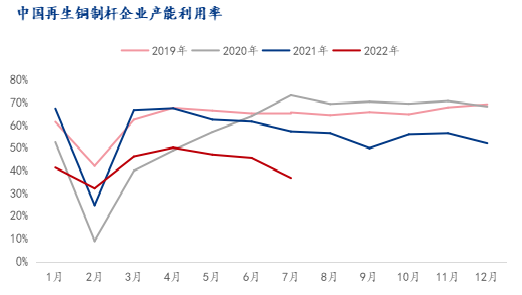 税改40号文件落地,提高税务成本,相对78号文件,再生铜票点提高1个点左右,受限于同类型精铜制品的销售价,再生铜销售价格存在上限,无法通过提高销售价格来转移成本。在再生铜供应紧张不变的前提下,再生铜加工企业被动接受上移的税务成本,利润空间再度收窄,“金九银十”季节再生铜加工企业不具备扩大生产的条件。今年以来再生铜相关生产企业产能利用率维持近年来低位,短期产能利用率重新回到往年位置难度较大。
