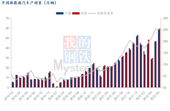 2022年6月,我国新能源汽车产销分别完成59.0万辆和59.6万辆,同比均增长1.3倍,市场占有率达到23.8%,延续保持高速增长态势,无论是产量和销量均是历史新高,并且从3月以来,连续四个月销量超过产量,市场消费强劲,新能源汽车需求也由政策驱动变为市场拉动。