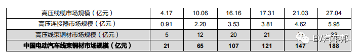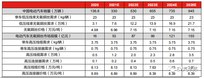 至 2025 年,中国电动汽车线束铜材市场规模合计 188 亿元,其中高压线束市场规模 33 亿元。据IDTechEx数据,每台电动汽车的低压线束需要无氧铜丝 23kg,至 2025 年我国电动汽车的无氧铜丝需求达 21.7 万吨,市场规模达 155亿元。假设每台电动汽车的高压线束分别需要线缆 3.89kg、连接器 0.5kg,至 2025年,我国电动汽车的高压线缆的需求为 3.5万吨,高压连接器的需求为 0.7万吨,则高压线束的市场规模为 33 亿元。中国电动汽车线束铜材市场规模合计 188 亿元,2021-2025 年复合增速 30%。