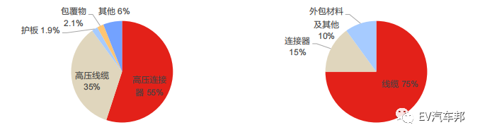 电动汽车高压线束包括连接器、线缆等,导电性能要求高。高压线束主要包括:高压连接器、高压线缆,接地端子和扎带、外包材料、胶带、热缩套管、胶套、安装支架等辅材。在高压线束系统中,线缆的重量占比一般为 75%左右,成本占比 35%左右;连接器的重量占比一般为 15%左右,成本占比 55%左右。电动汽车将以电能运用为主,在电能的加载、控制和应用上离不开导电性能优越的材料。线束导体材料一般为退火纯铜,根据汽车不同位置使用要求,也会采用一些铜合金。