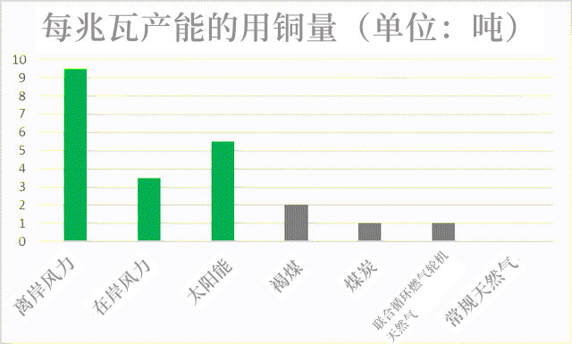 首先,随着绿色转型的发展,环境、政府、经济发展的需要会合力推动绿色能源生产的需求。数据显示,风能发电和太阳能发电消耗的铜是化石燃料的数倍。