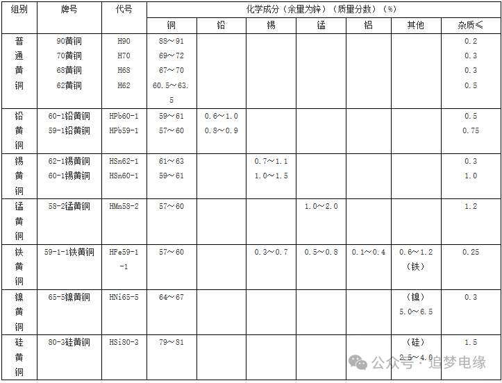 1.形成电化学腐蚀:黄铜主要由铜和锌组成(黄铜种类太多,组分也很复杂,附图如下,可以参考),当黄铜与纯铜或铝导线连接时,在潮湿或有腐蚀性气体的环境中,可能形成微电池效应,导致电化学腐蚀,导致导致接触电阻增加,长期可能引起过热、绝缘损坏,装置寿命降低,甚至火灾等安全事故。