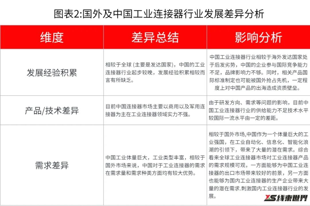 综合上述分析,国外及中国工业连接器行业发展差异对中国工业连接器产品参与全球贸易的影响如下: