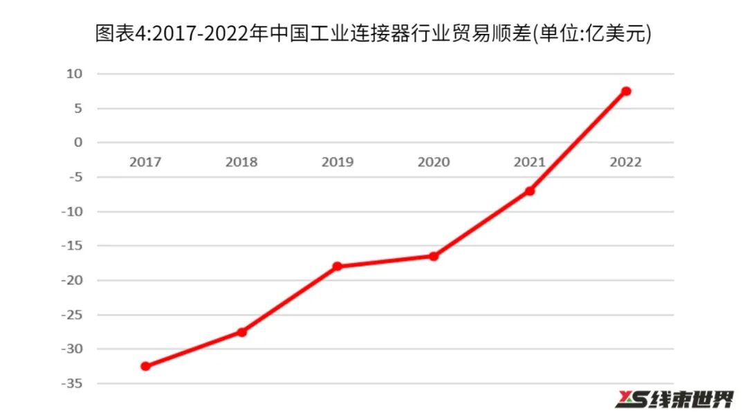 海关总署的数据显示,近年来中国工业连接器行业的贸易逆差逐渐缩小,中国工业连接器产品的出口额不断增加。2022年,中国工业连接器行业的进出口贸易已经由贸易逆差转为贸易顺差,全年实现贸易顺差7.69亿美元。