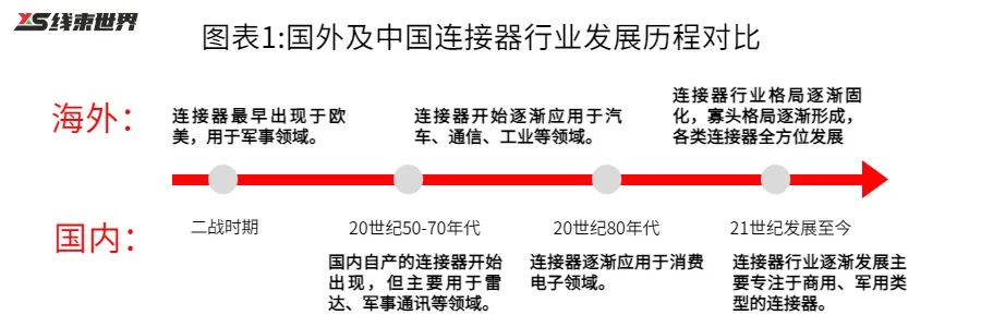 从工业连接器行业的发展历程对比来看,中国的连接器最早出现于20世纪50-70年代,这一时期,国内主要的连接器生产企业以国有企业为主,主要应用于雷达设备、通讯等领域。随着技术的发展,20世纪80年代时,连接器逐渐应用于中国的黑白电视以及消费电子等领域。发展至今,中国的连接器行业已经有了长足的发展,形成了以立讯精密、中航光电为核心龙头的连接器行业格局,但中国连接器企业主要专注于商用以及军用领域的连接器产品的研发。