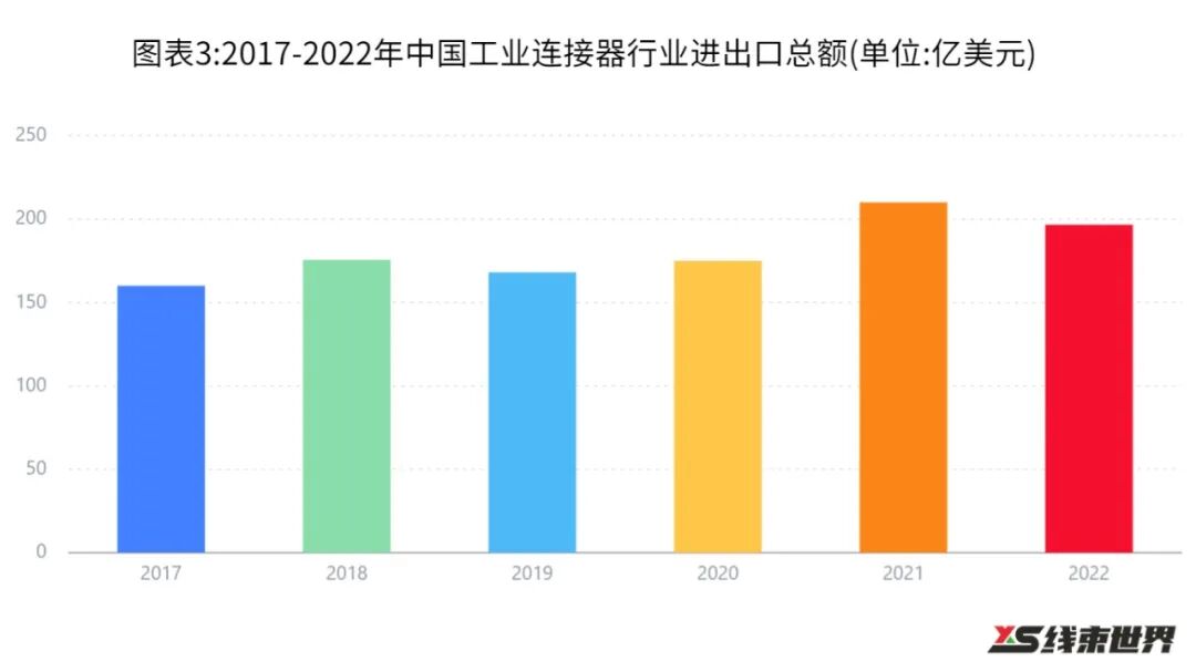 根据中国海关总署的数据,中国工业连接器行业的进出口总额基本保持稳定,近年来一直保持在170亿美元左右,2021与2022年时受疫情影响有了一定幅度的增加。2022年全年,中国工业连接器行业进出口总额为196.6亿美元。