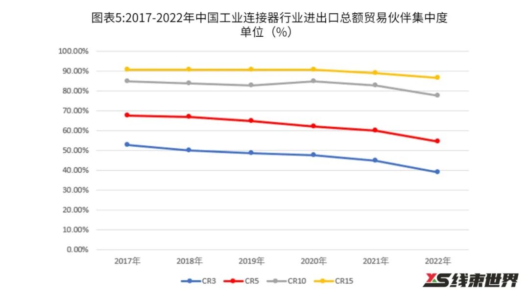 从进出口总额贸易伙伴集中度近年来的变化趋势来看,中国工业连接器行业的进出口贸易集中度呈现不断下降的趋势。CR3、CR5、CR10和CR15分别从2017年的52.86%、67.77%、84.86%和90.56%下降至2022年的39.16%、54.39%、77.52%和86.48%。