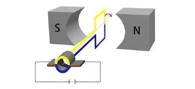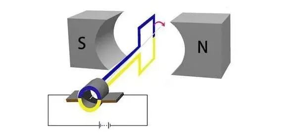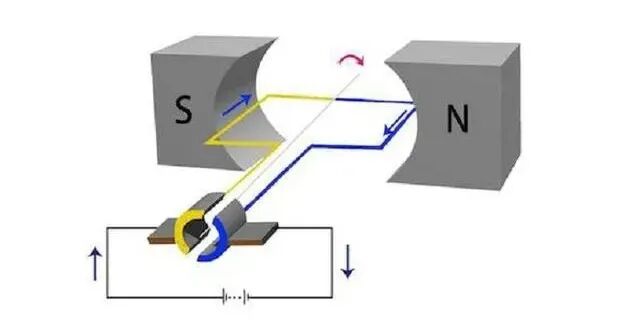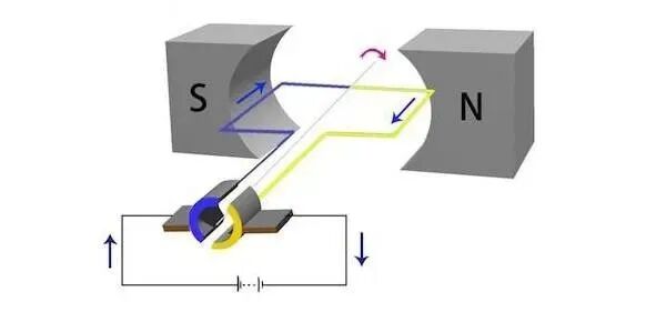 如图1所示,这是一个直流有刷电机结构模型图。两个固定的异性磁铁,中间放置一个线圈,线圈两端分别接在两个半圆形的铜环上,铜环两端与固定的碳刷相接触,然后给碳刷两端分别接上直流电源。