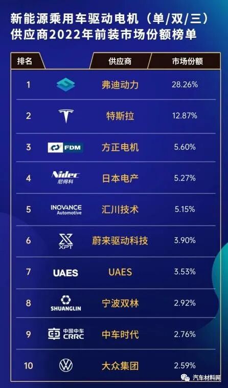 国内电机市场份额前五,分别是比亚迪旗下的弗迪动力(28.26%)、特斯拉(12.87%)、方正(5.60%)、日本电产(5.27%)、汇川技术(5.15%)。