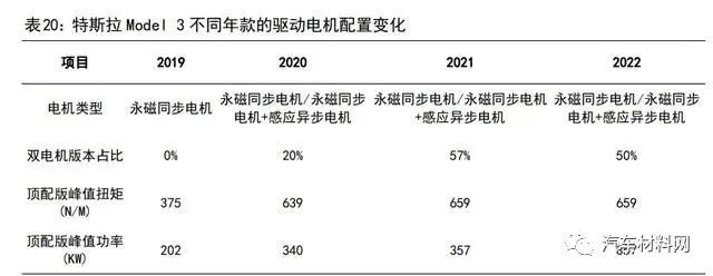 特斯拉的早期车型多采用感应异步电机(Roadster等),2019款的海外特斯拉Model 3 在单电机版本上依然搭载了感应异步电机,在双电机版本上则搭载前驱永磁同步电机搭配后驱感应异步电机。2019款国产版的特斯拉Model 3 单电机版本则搭载的是永磁同步电机。现阶段,特斯拉Model 3、Model Y、Model S、Model X 等车型均在单电机版本上搭载永磁同步电机,在双电机版本上搭载永磁同步电机+感应异步电机。新款特斯拉Model S Plaid三电机版本搭载的全部是永磁同步电机。总体来看,特斯拉的驱动电机配置趋势是数量越来越多,性能越来越强,永磁同步电机的渗透率越来越高。