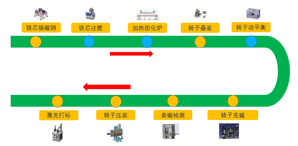 ✓ 转子生产线工艺流程为:铁芯插磁钢-铁芯注塑-加热固化-转子叠装-转子动平衡-转子充磁-表磁检测-转子压装-激光打标;
