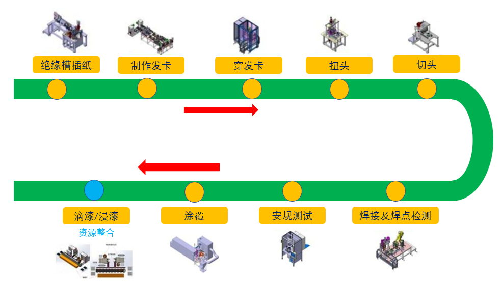 ✓ 扁线电机定子组件制造工艺流程包括:插纸、线圈成型、预插入、整体插入、扩口、扭头、切平、焊接、涂敷及浸漆、铜鼻子焊接;