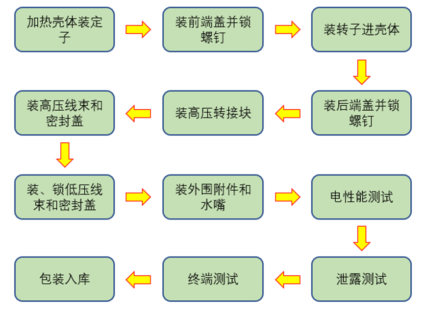 电机总成装配线主要常规工站(举例):水套热装工位、轴承热装工位、定子入壳工位、电测试工位、定转子合装工位、试漏工位等,以及智能通讯与MES数据管理系统